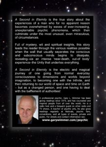 A professional psychic for decades, Gary L. Wimmer had an intense but enlightening and life-changing “near-death” experience (NDE) in 1977 that revealed the Unity that underlies everything. That profound experience still empowers him to this day. He wrote about it in his book, A SECOND IN ETERNITY, available on Amazon and Kindle.